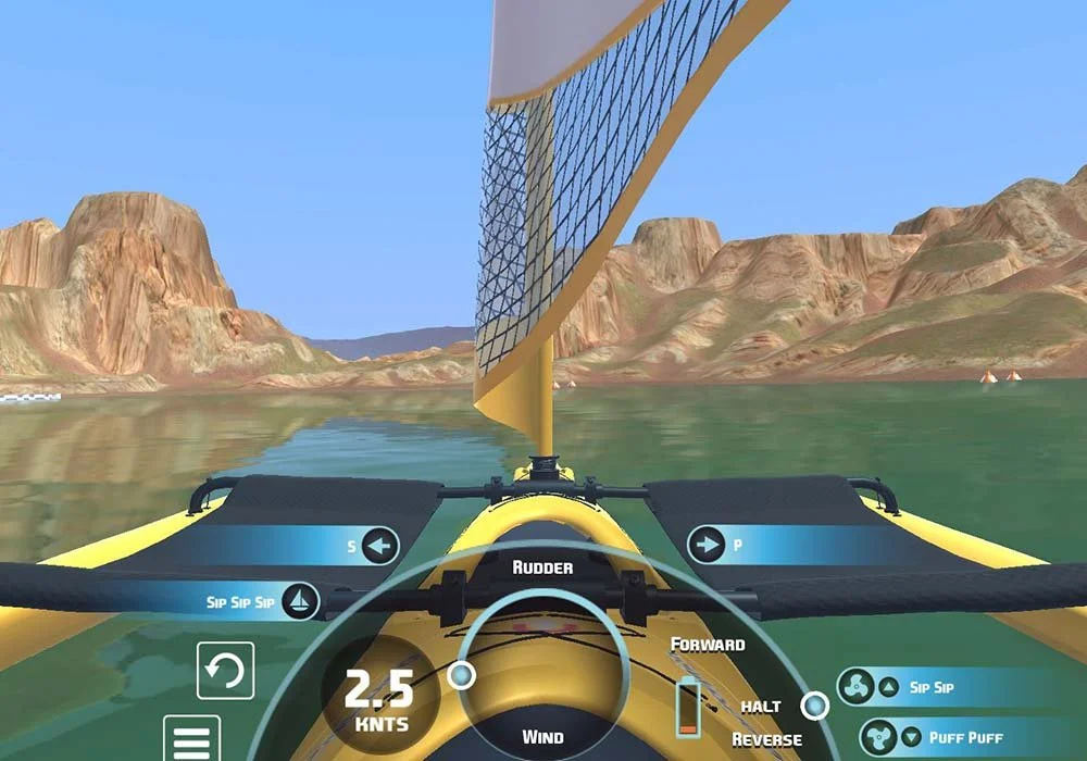 The Tetra Watercraft is built on top of the Hobie Tandem Island sailing kayak and uses both a joystick and mouth-controlled sip-and-puff system for independent control of steering, sail management, and electric propulsion.