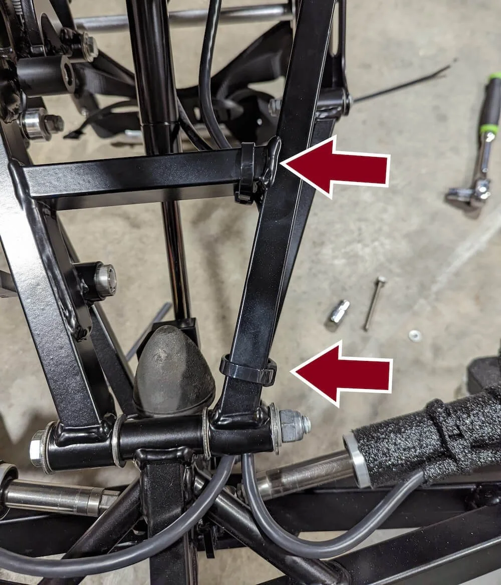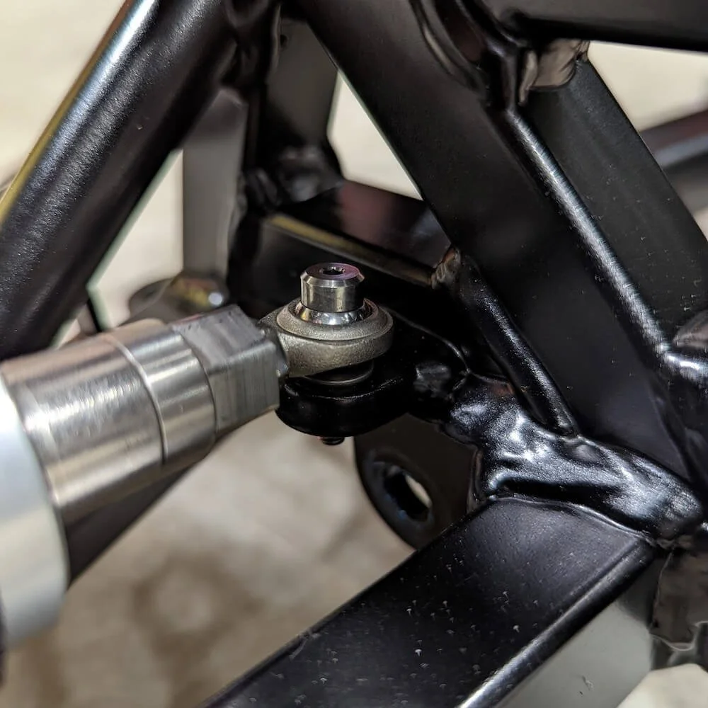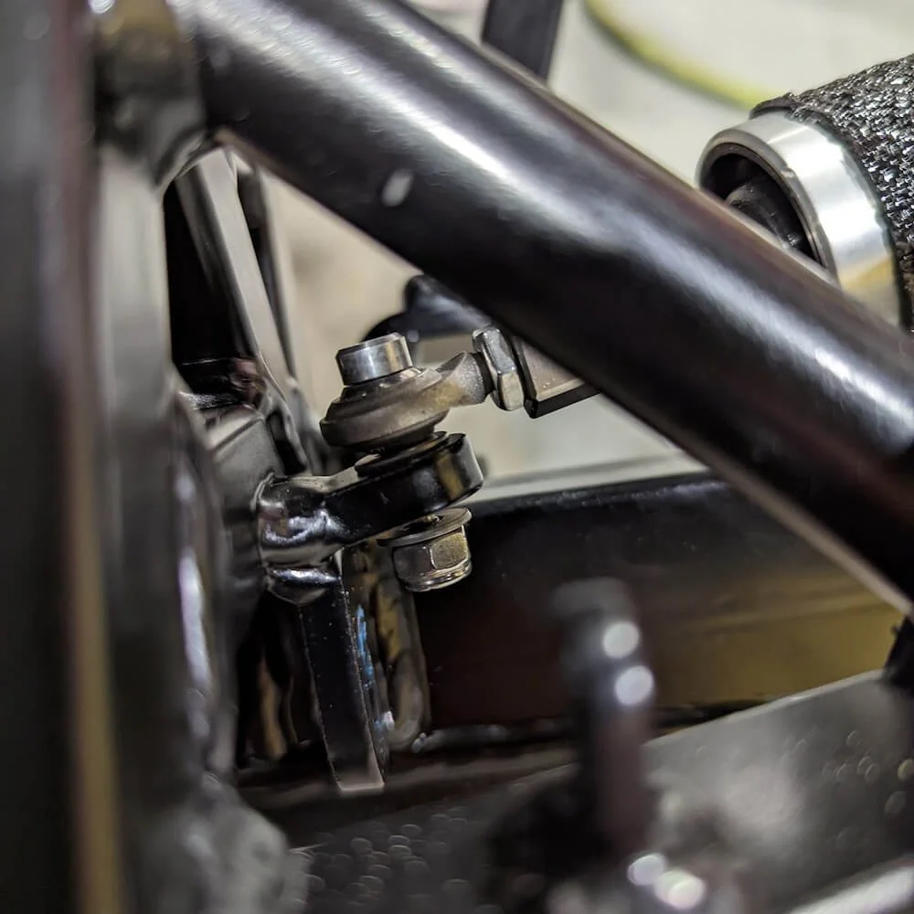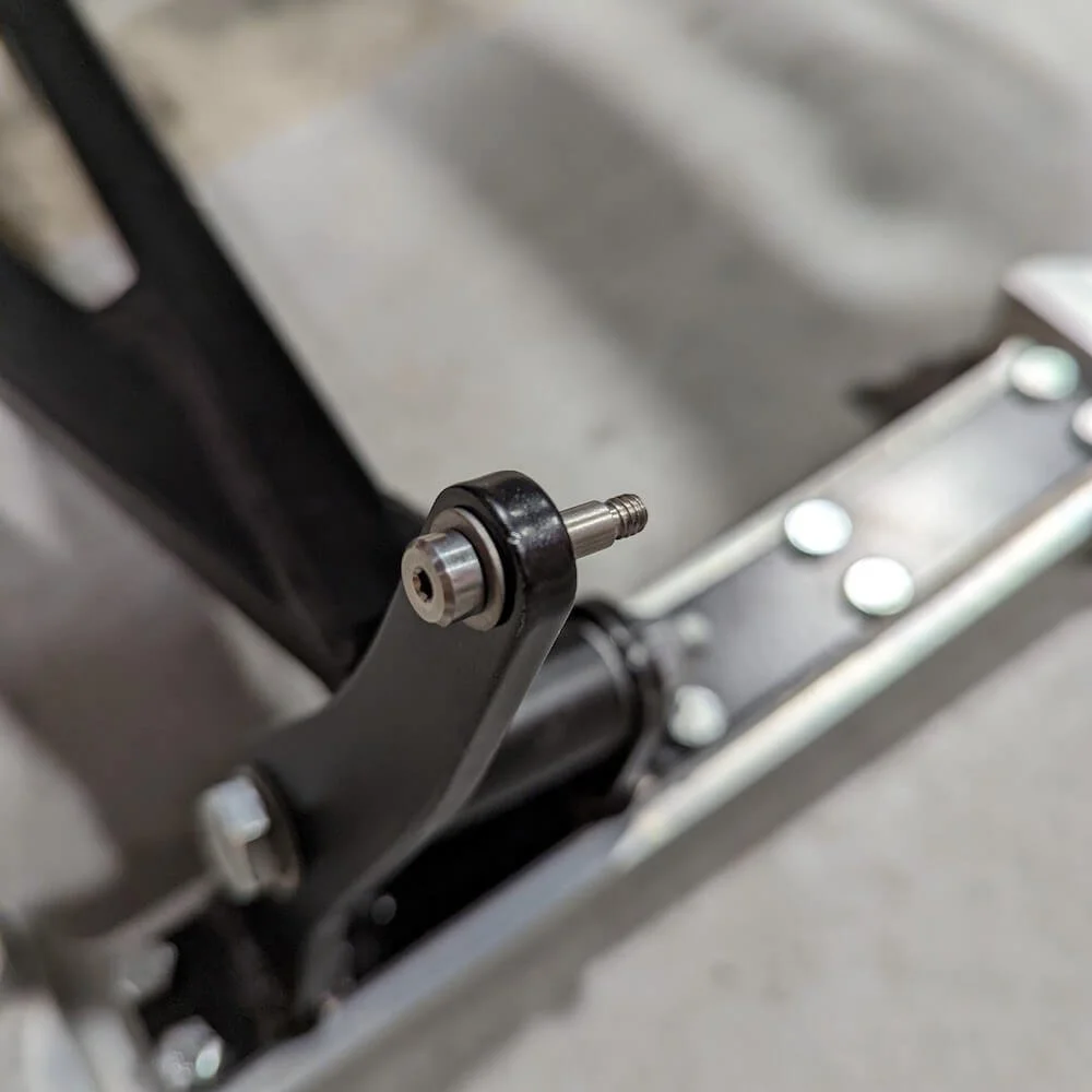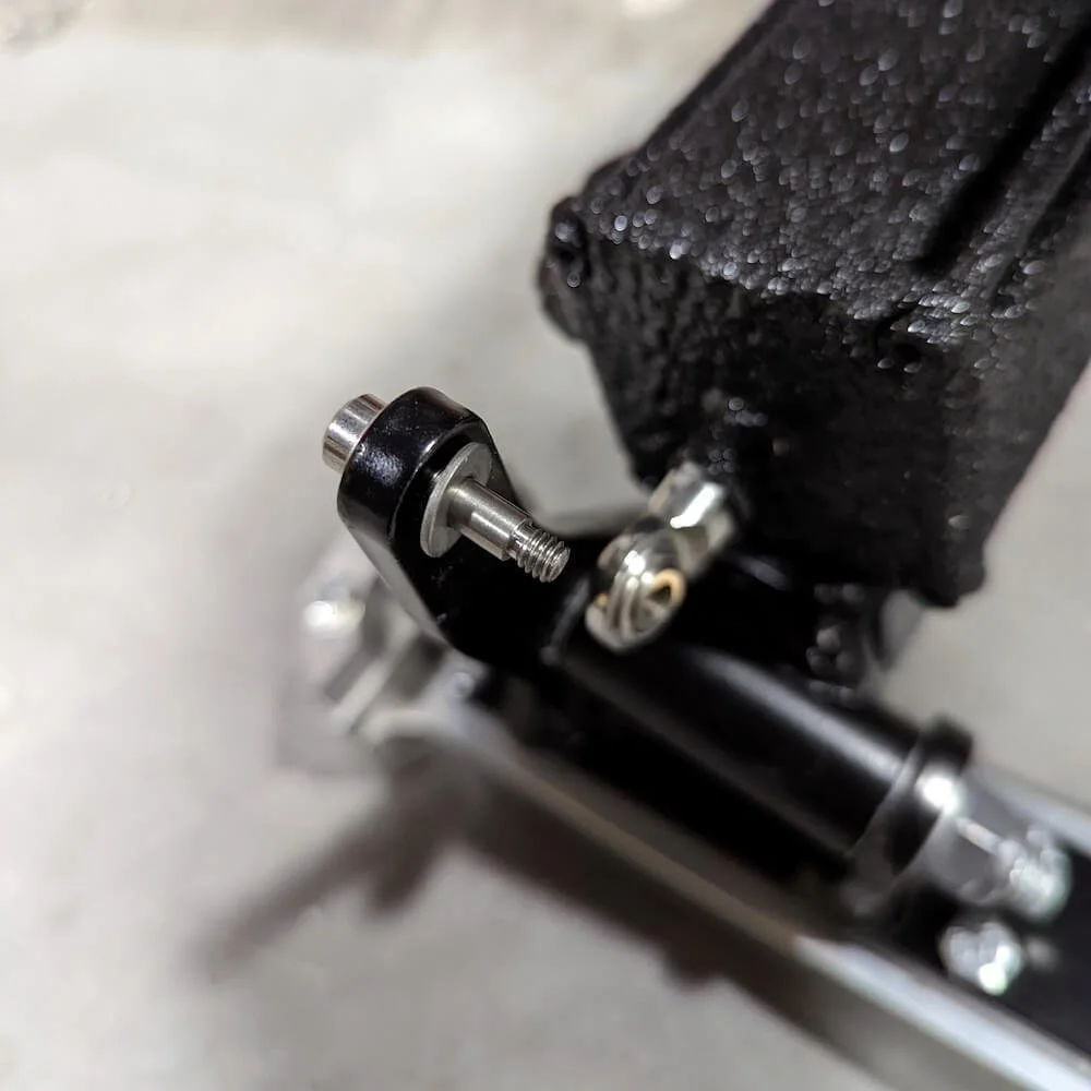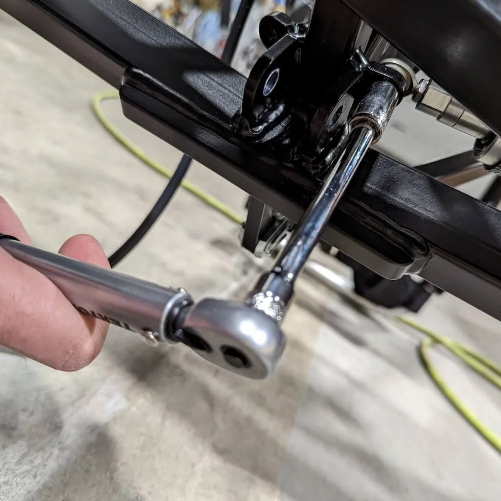 (3) Using the 3/32” allen key and 11/32” socket/extension, remove the broken actuator that is attached to the ski. The inner connecting bolt will require tilting the TetraSki forwards onto the footrest to access. Try to remember where the washers go (the washers should always sandwich the black tabs on the frame).